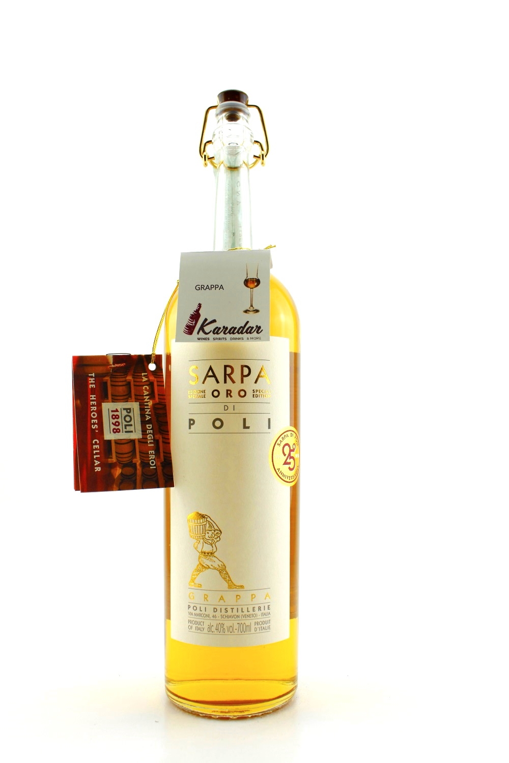 Diese Grappa Veneta, ein Nachkomme des jungen Sarpa, wird geduldig in den unterirdischen Kellern der Brennerei Poli gelagert. So erhält er Weichheit und Aromen von Zedernholz, Lakritze und Vanille, die sich gut mit seinem artikulierten, umhüllenden Geschmack verbinden.