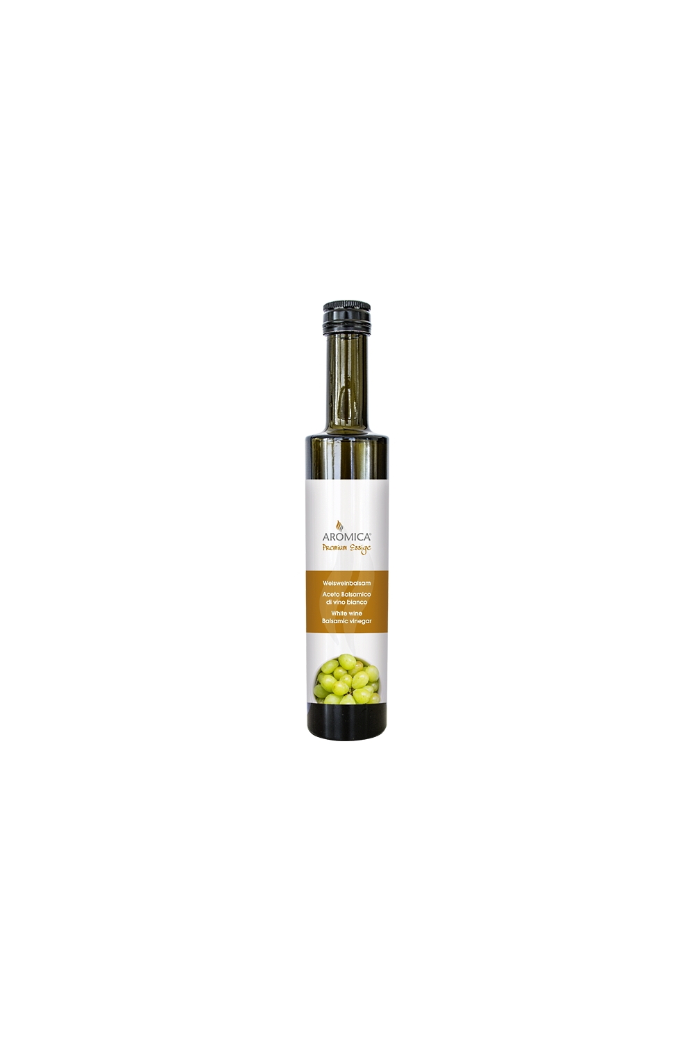 AROMICA® Premium-Essig Weißwein Balsam, hergestellt nach traditioneller Balsamico-Methode. Aus Traubensaft durch schonendes Einköcheln und Veressigen gewonnen. Im Eichenfass gelagert mit milder Säure. Milder ausgewogener Geschmack, sehr geeignet für verschiedene Salate und Vorspeisen.