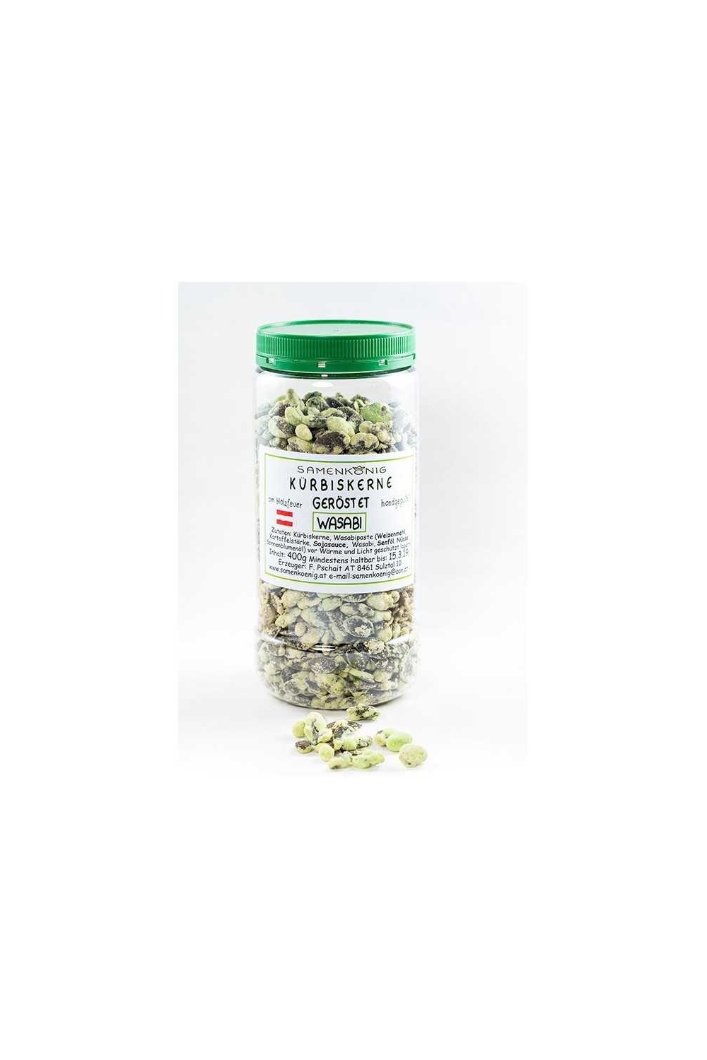 Der rohe Kürbiskern wird am Holzfeuer schonend geröstet und anschließend wird der Kern mit der Wasabi-Masse, von Hand solange vermengt bist alle gut mit dem Wasabi gut eingepackt sind. Wasabi schmeckt unserm Krenn (Meerrettich) sehr ähnlich, zum Knabbern für Liebhaber ein absolutes Highlight. Findet in der Küche individuellen Einsatz, als kleiner Snack, bei Hauptgerichten oder auch fantastisch zu kalten Vorspeiesen. Überraschen sie ihre Gäste damit.