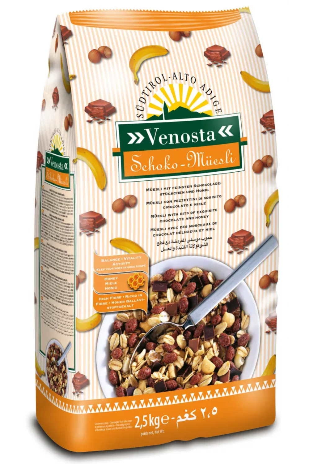 The Venosta chocolate muesli from Fuchs promises crispy, crunchy nibbling fun at the breakfast table. High-quality cereal flakes, rich in valuable fiber, and exquisite chocolate chips are refined with a little honey. Who can still claim that delicious and nutritious do not go together?